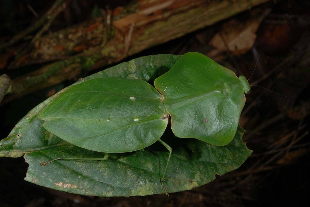 Фото богомола: Choeradodis rhombicollis, перунианский богомол-щитоносец. Как и другие представители своего подсемейства, превосходно маскируется под зелёную листву.
