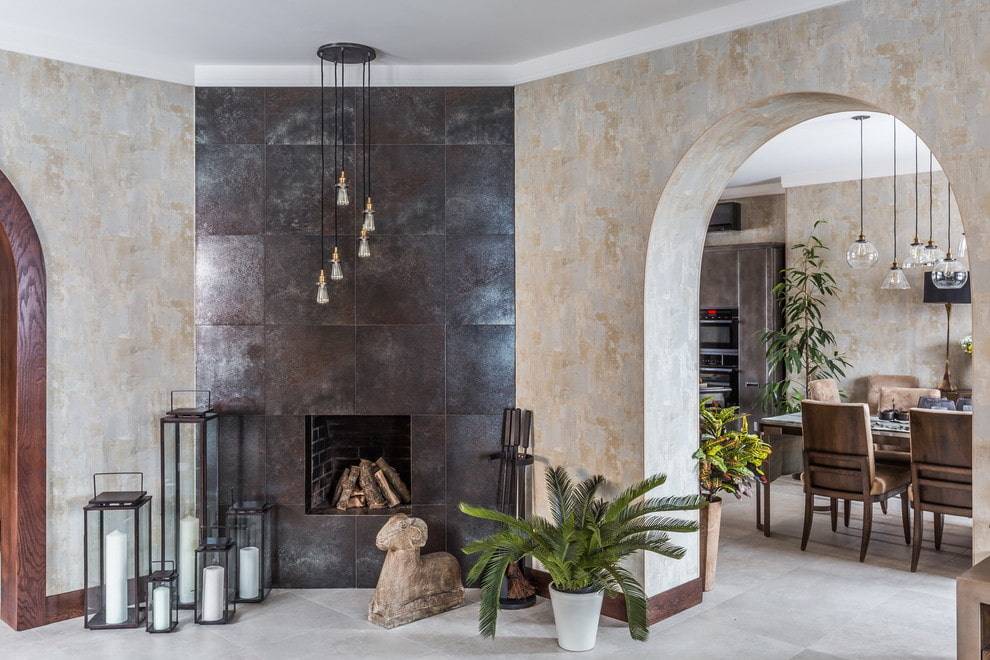 Является очень популярным отделочным вариантом для проема без дверей. Искусственный или натуральный камень, например, известняк, мрамор, малахит и многие другие, привнесут в обстановку нотки Средневековья и сформируют неповторимый дизайн, чаще всего применяемый для деревенского стиля кантри или прованс.