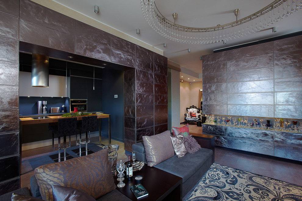На фото кухня-гостиная с дверным проемом без двери, декорированным темной плиткой.