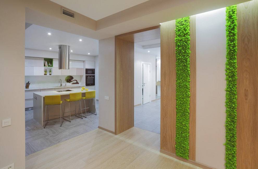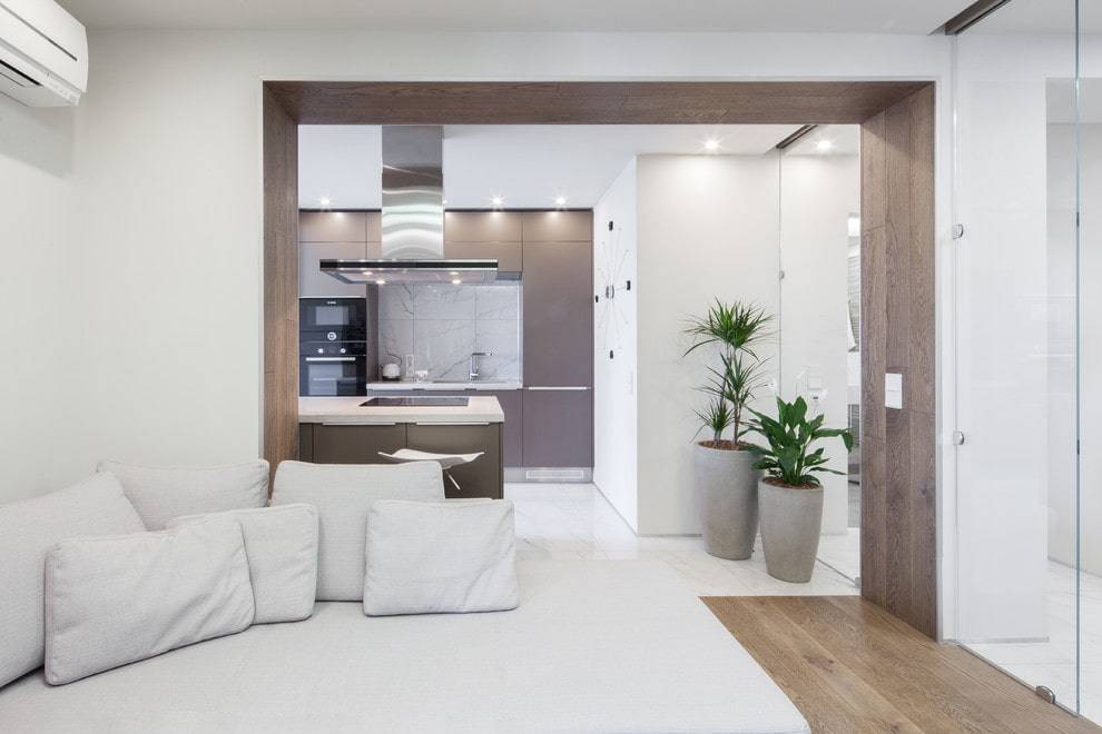 На фото дверной прямоугольный проем без двери, облицованный ламинатом в интерьере в современном стиле.