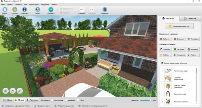 В каталоге есть объекты для зоны отдыха, сада, огорода, детской площадки. Внешний вид любого предмета можно выбрать самому, например, взять кирпич другого цвета, изменить размер дерева и оттенок цветов на клумбе. Можно создать реалистичную 3D-модель участка и пройти по нему, словно персонаж игры, в режиме «Прогулка». Графика очень реалистичная, а освоить программу сможет даже новичок.