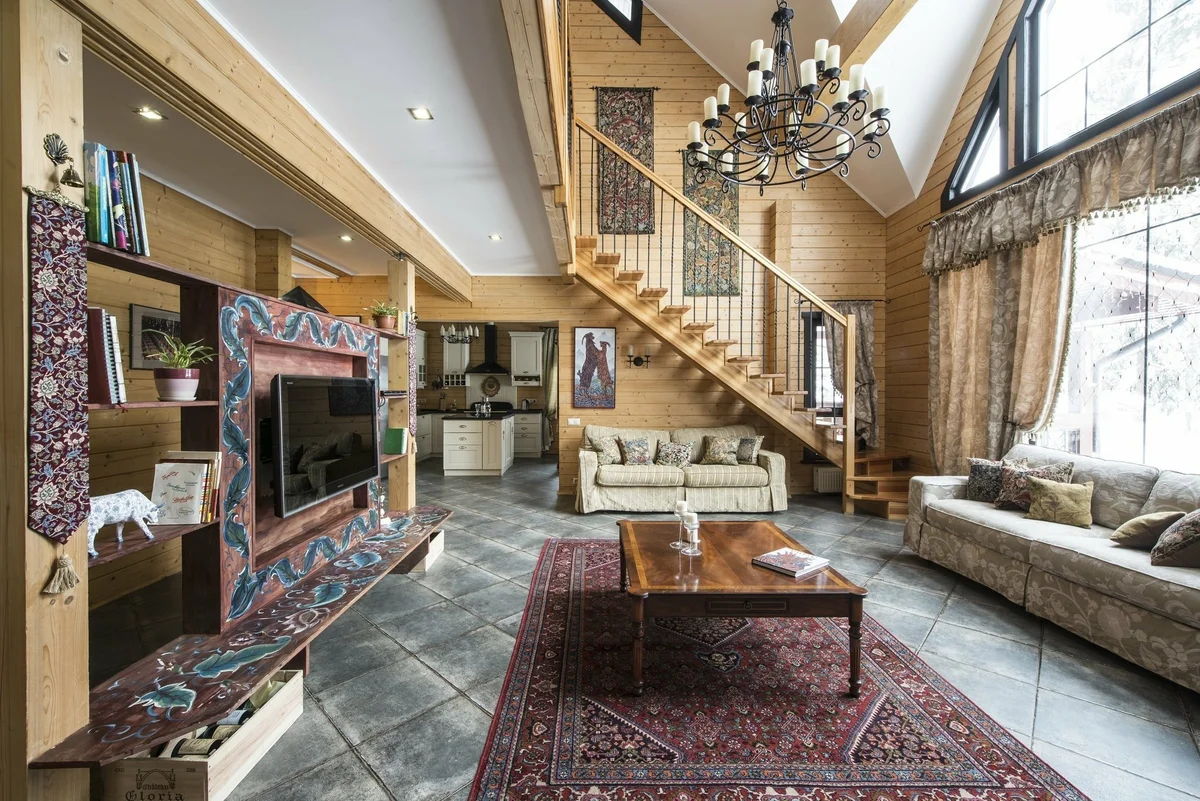В просторной гостиной супруги организовали несколько мест для отдыха. Напротив камина поставили небольшой диван со съёмным чехлом в розовой гамме. Около входной зоны обустроили уютный уголок с высокими креслами и антикварной консолью из красного дерева.