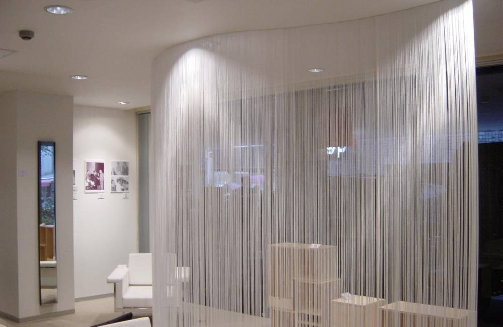 Потолочные конструкции устанавливаются не только на оконные проемы — их можно использовать и как разделительную штору в комнате. Перегородочные гардины лучше устанавливать при натяжном потолке скрытым способом, спрятав за полотно крепеж конструкции. Декоративные модели в этом случае будут неуместны.