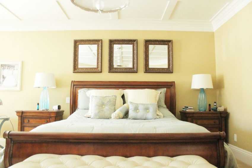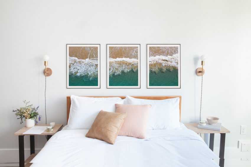 Психологи не советуют размещать над кроватью много мелких и тем более разноплановых предметов, например, картин вперемешку с фотографиями. Это будет выглядеть хаотично и вряд ли поможет создать в спальне спокойную и умиротворяющую атмосферу.