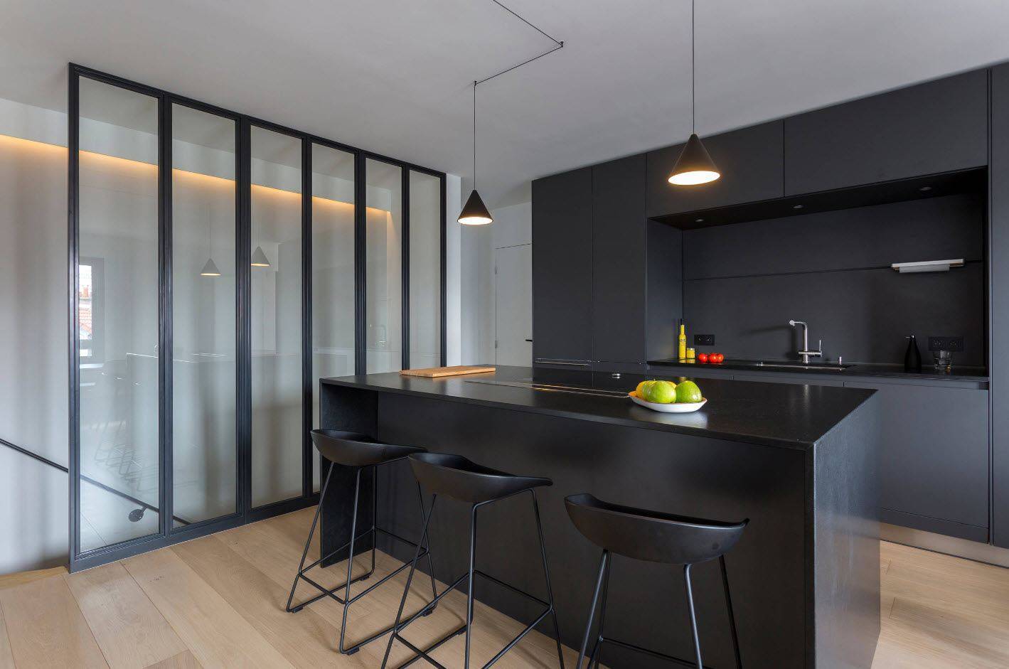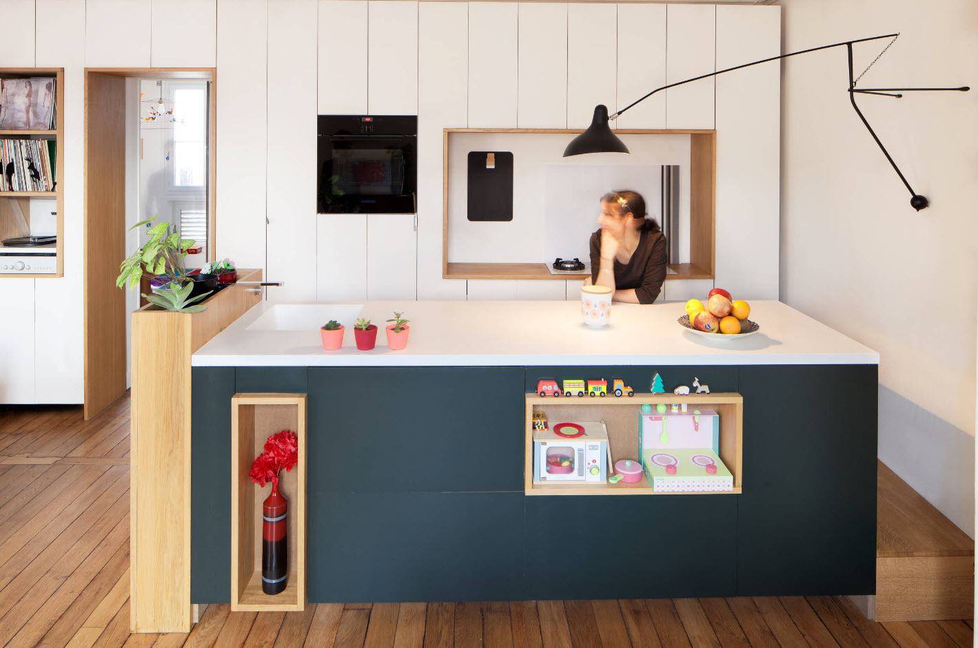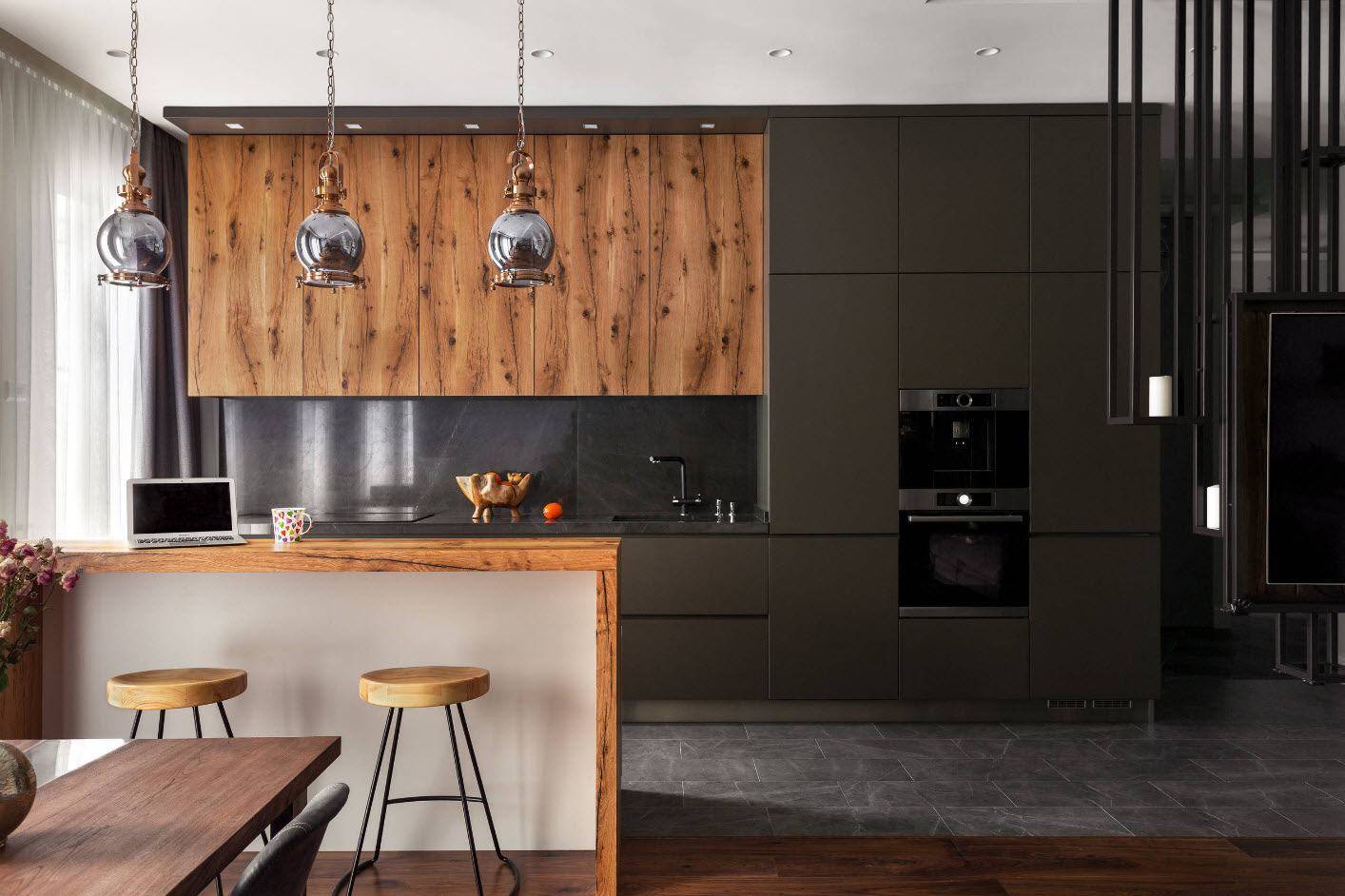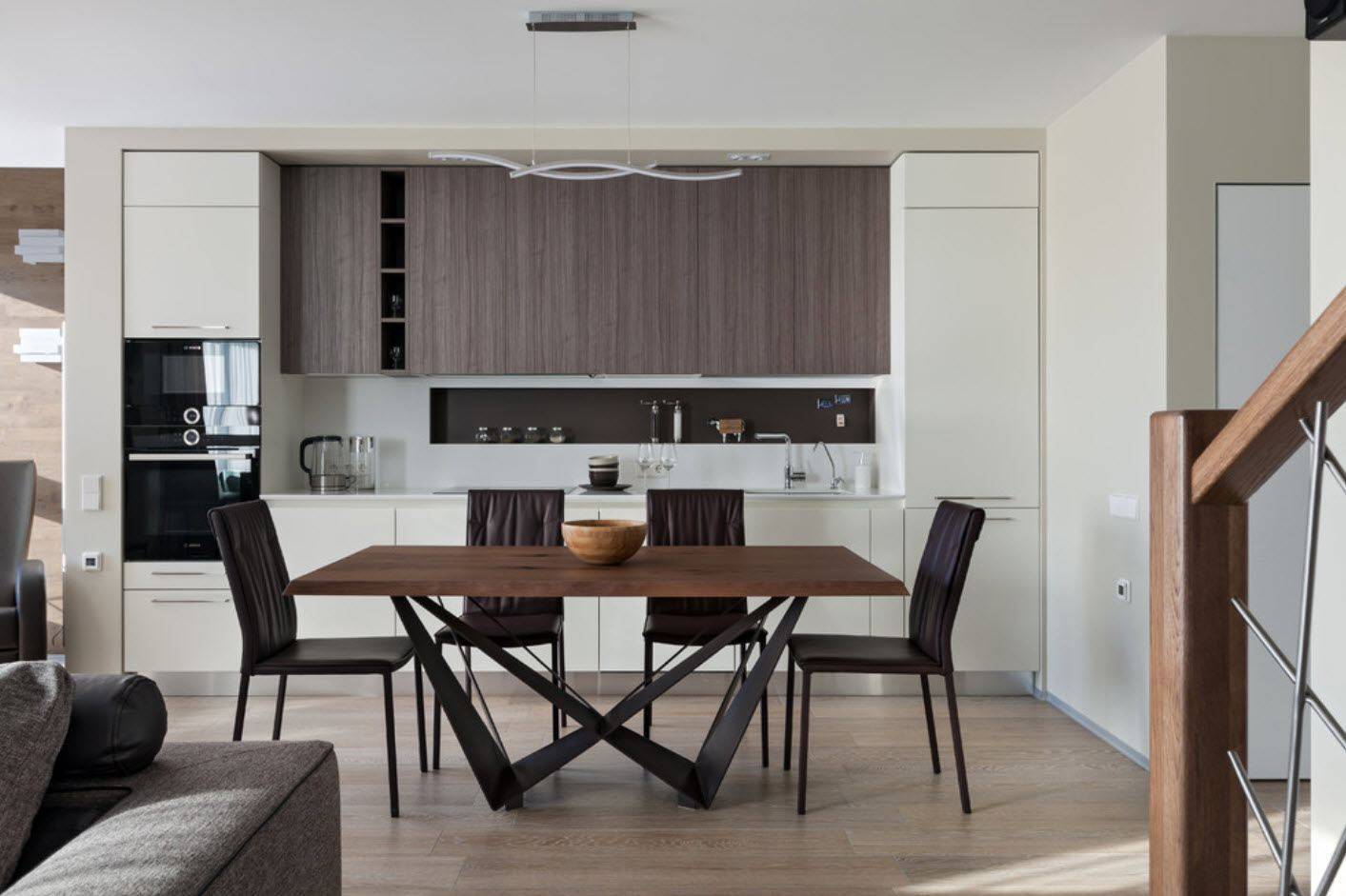 - Второй — использовать лестницу как одну из стен кухни. Этот тип решения особенно рекомендуется в квартирах, где, кроме лестницы, владелец дома имеет в своем распоряжении большую площадь, прилегающую к лестнице.