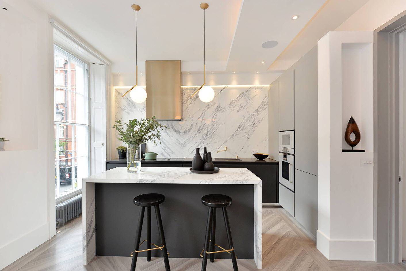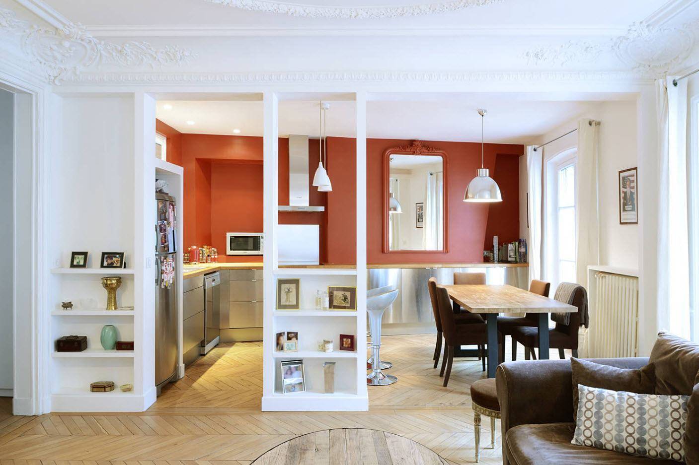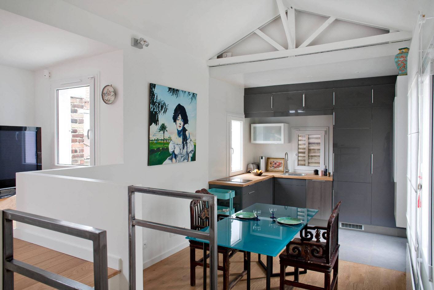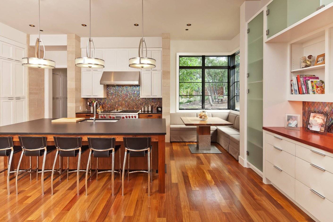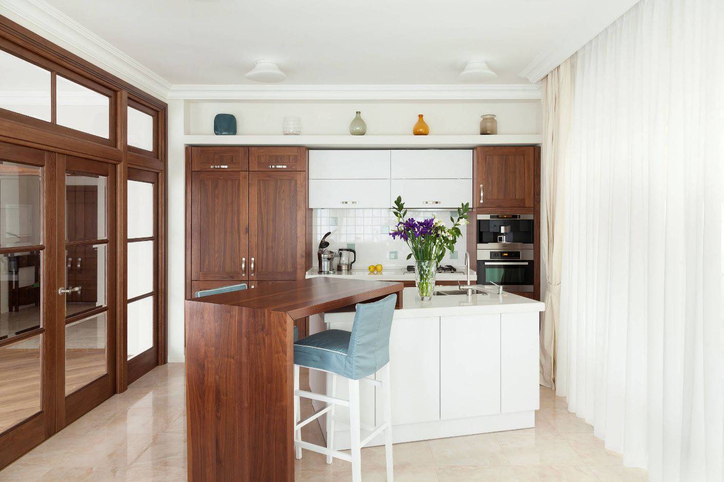 - Второй — использовать лестницу как одну из стен кухни. Этот тип решения особенно рекомендуется в квартирах, где, кроме лестницы, владелец дома имеет в своем распоряжении большую площадь, прилегающую к лестнице.