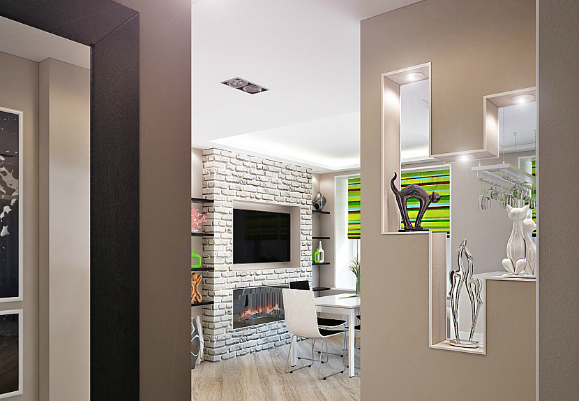 Углубление для электрокамина, инкрустированное плиткой или другими эффектными материалами, позволяет создать в помещении теплую и домашнюю обстановку.