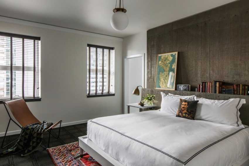 Модная сегодня интерпретация комнатного пространства ориентирована на минимализм, но не аскетичный и холодный как в хай-теке, а уютный и наполненный комфортом. На фото такой спальной комнаты отлично видно насколько удачно комбинируются в интерьере арт-объекты и вещи обыденного функционала, лаконичные формы и необычные декоративные элементы.