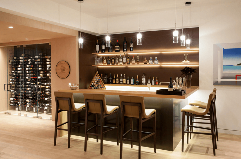 Конструкцию можно задействовать под барный уголок. Полки желательно украсить коллекционными бутылками