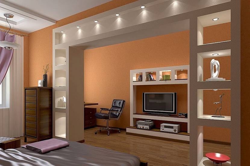 Задействовать для размещения телевизора и другой техники. Легко можно скрыть провода и кабели, эффектно зонировать пространство.