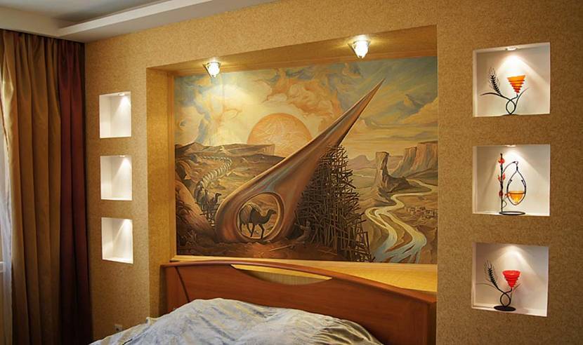 Неглубокую конструкцию используют в качестве декоративного элемента. В нее помещают картины, панно и фрески. Если правильно оборудовать подсветку, поместить на выступ вазон или статуэтку, можно сделать из углубления необычный и эффектный арт-объект.