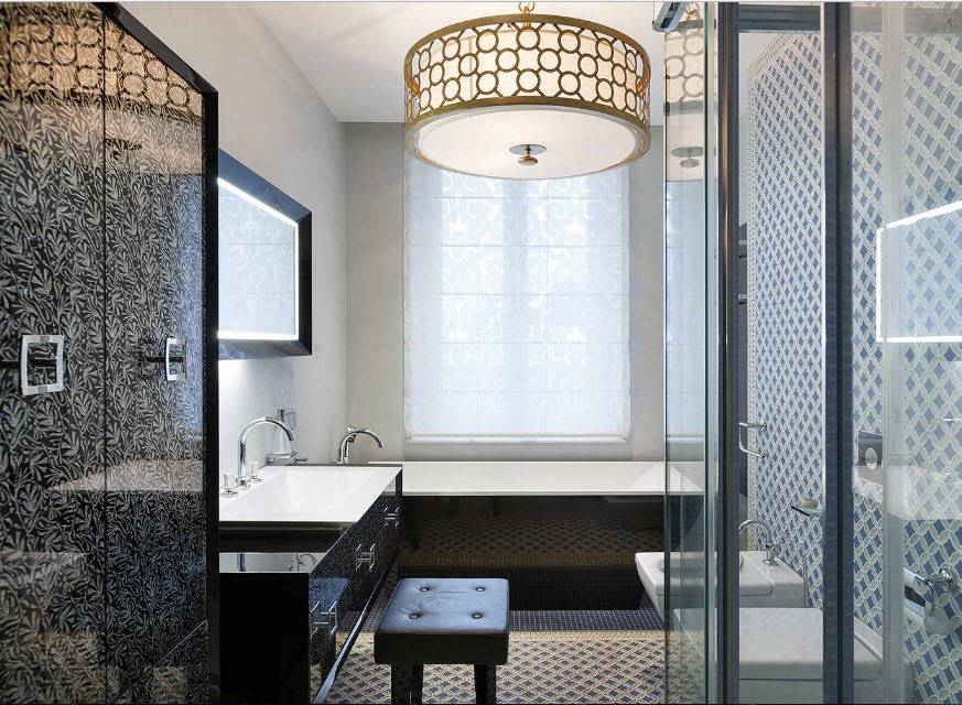 - Если интерьер оформлен в холодных тонах, поставьте в осветительные приборы лампочки с теплым желтым цветом. Этот прием сделает нахождение в ванной более комфортным.