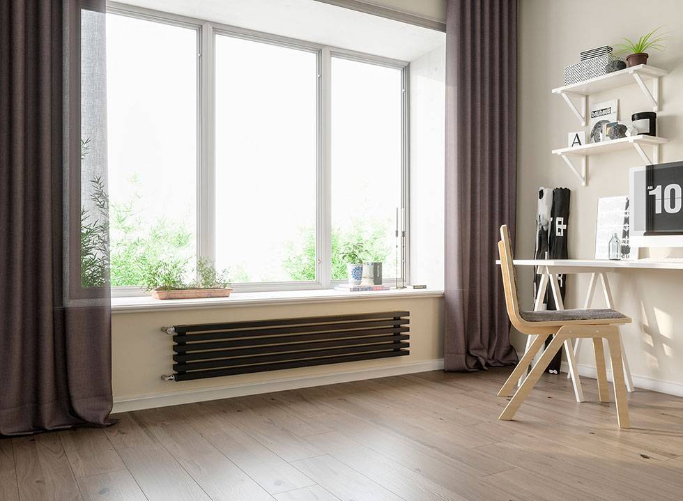Но у низких радиаторов есть недостатки. Их устанавливают перед окном, поэтому частично закрывается панорамный вид.