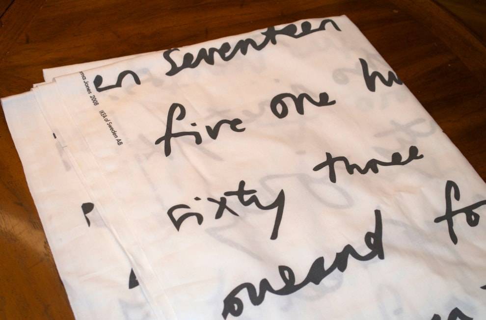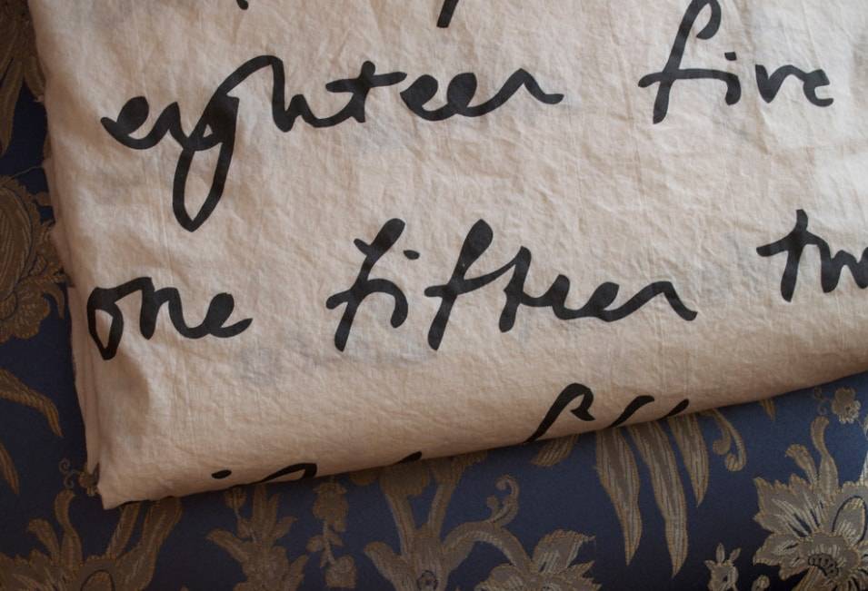 Белая ткань с надписями смотрится довольно привлекательно, но все же предлагаем ее немного тонировать с помощью чая.