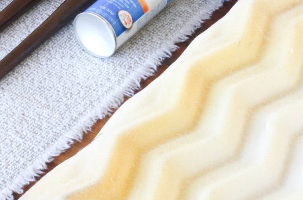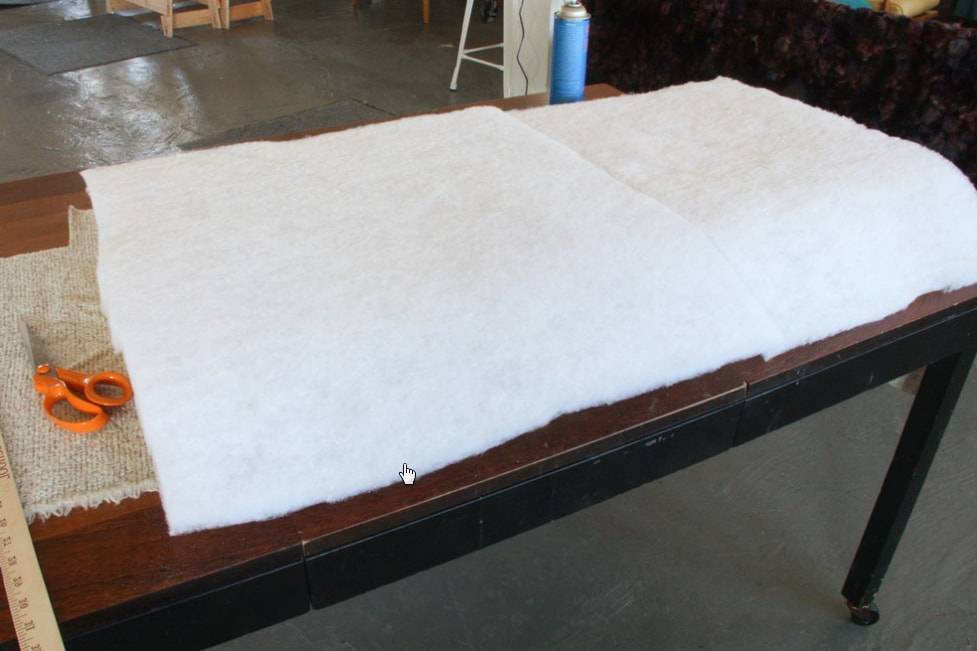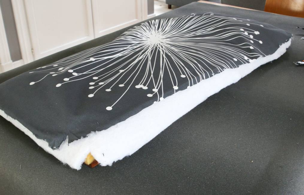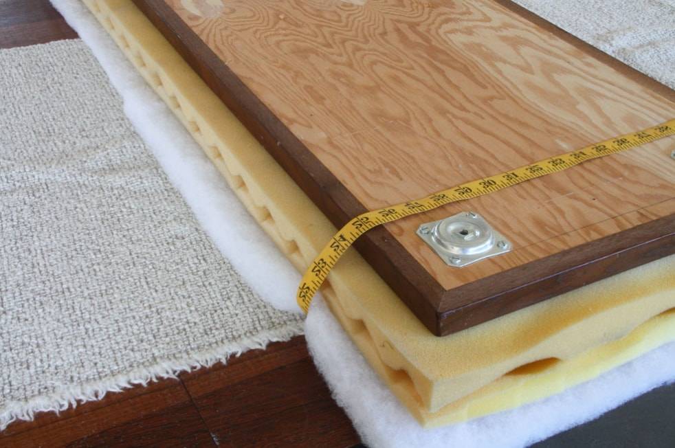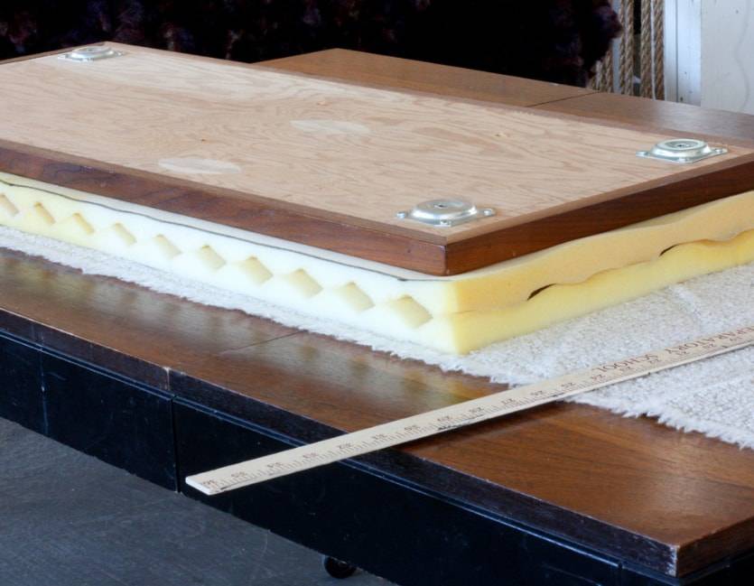 Чтобы банкетка была более мягкой, лучше использовать два слоя поролона. Для этого кладем их рельефными сторонами вовнутрь и наносим клей-спрей, чтобы надежно их зафиксировать.