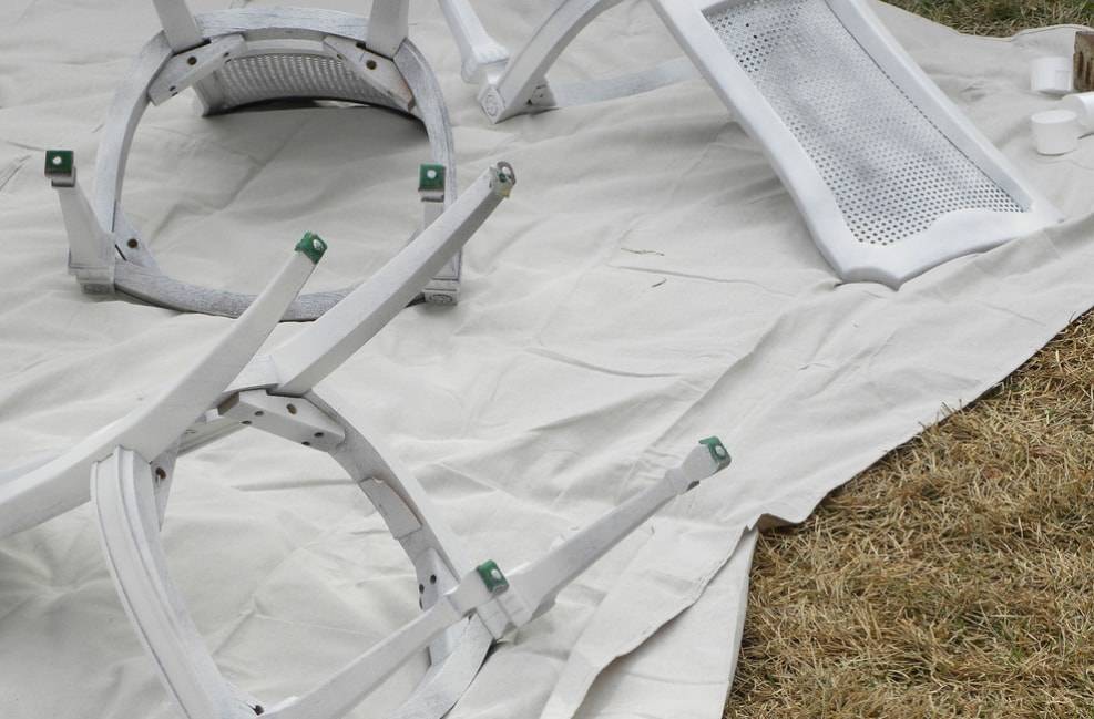 Окрашиваем стулья с помощью грунтовки в баллончике. Если вы планируете делать это в домашних условиях, то обязательно постелите на рабочую зону пленку, чтобы не испортить ее.