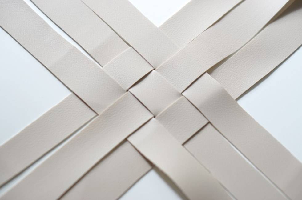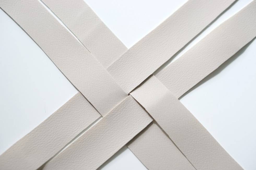 Откручиваем ножки табурета и приступаем к плетению. Для начала перекрещиваем четыре полоски между собой, как показано на фото. Закрепляем их с внутренней стороны степлером.