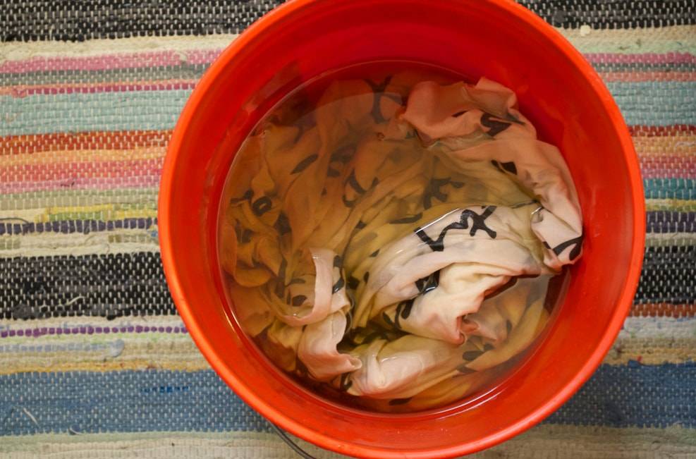 Наполняем пластиковую емкость горячей водой и бросаем в нее несколько пакетиков чая. Следом помещаем туда ткань и оставляем на несколько часов. Периодически можно помешивать воду, чтобы цвет был более равномерным.