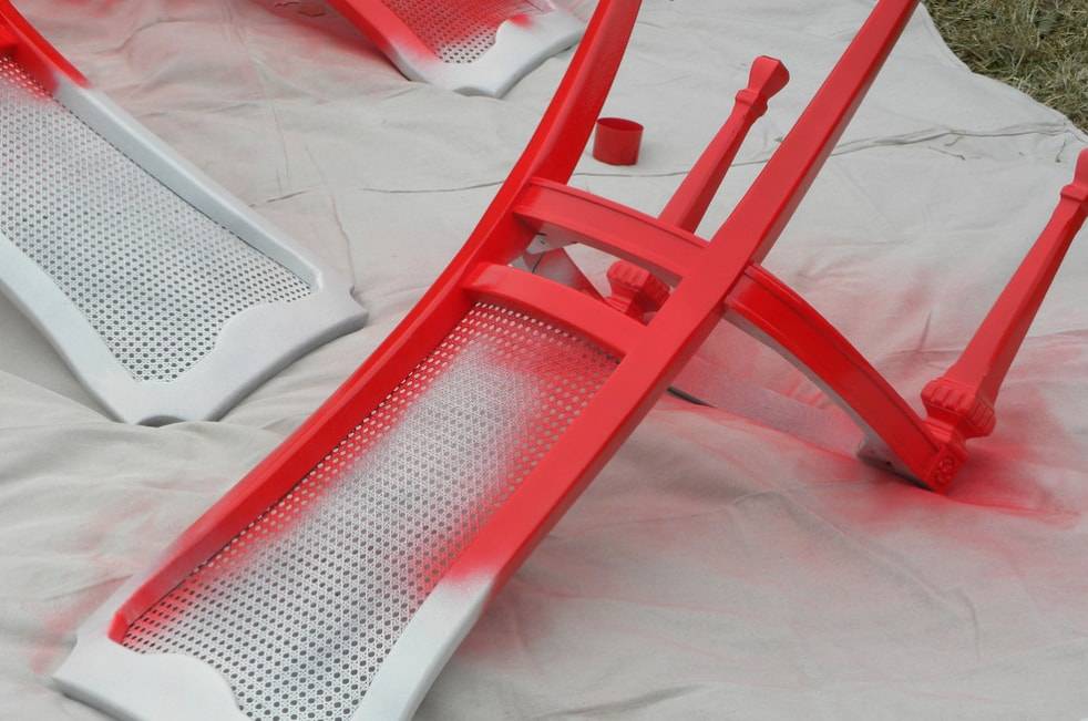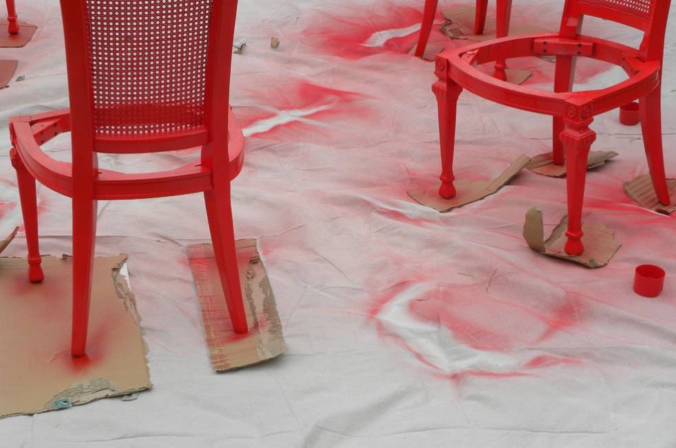 После того, как грунтовка высохла, приступаем к следующему шагу. Окрашиваем стулья красным цветом и оставляем не несколько часов до высыхания.