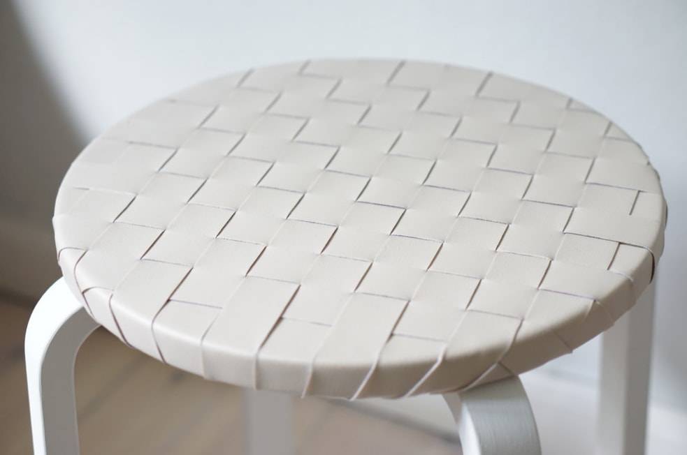 Повторяем то же самое до тех пор, пока полоски не покроют всю внешнюю поверхность табурета. Излишки материала с внутренней стороны обрезаем так, чтобы их не было видно.