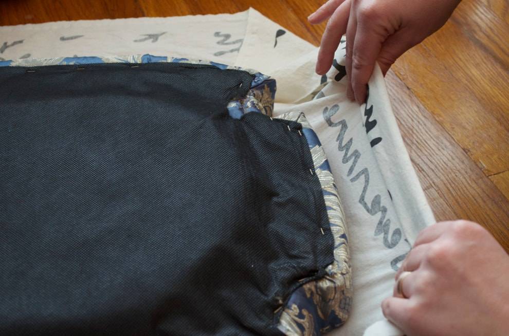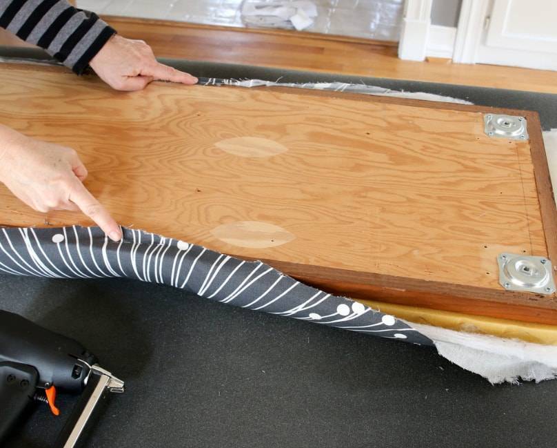 Подворачиваем срезы и прикрепляем ткань к нижней части сидения с помощью степлера.
