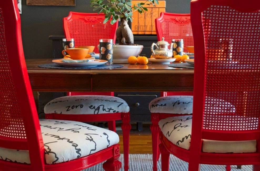 Конечно же, деревянные стулья с жаккардовой тканью на сиденьях – это классика. Но к сожалению, именно такая мебель довольно быстро тускнеет и теряет привлекательный внешний вид. Впрочем, если вы готовы к экспериментам и ярким сочетаниям, то предлагаем прямо сейчас заняться их преображением.
