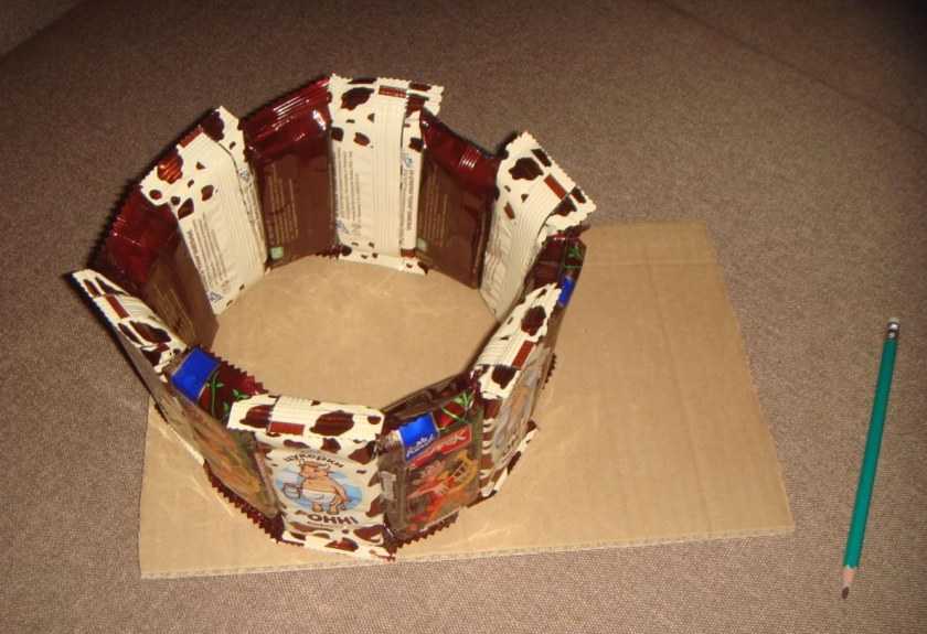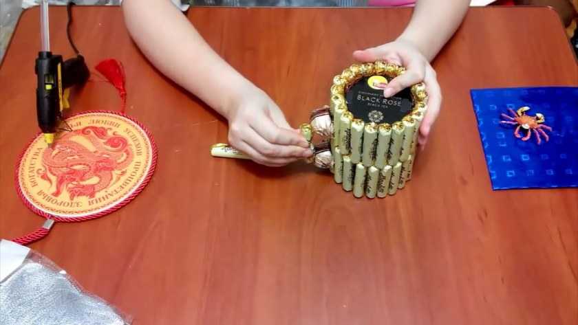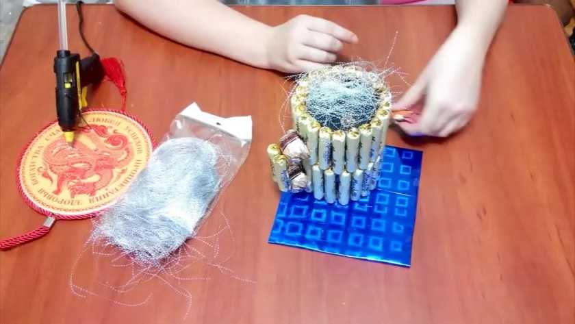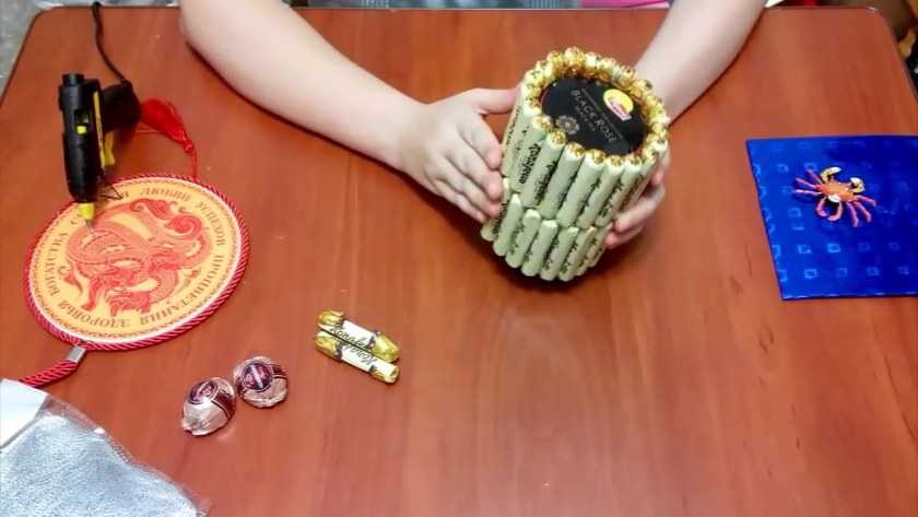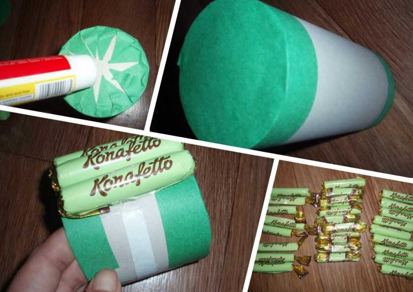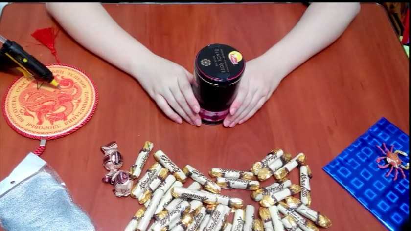 Банку по кругу обклеить конфетами, получится два ряда конфет.