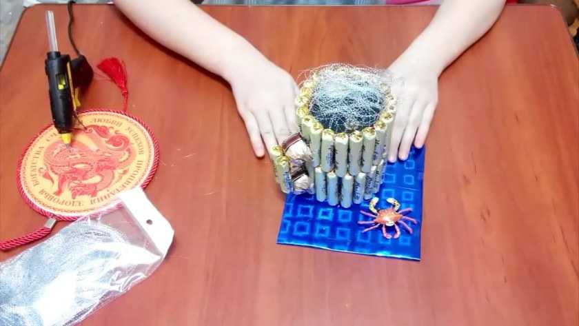 Гофрированная бумага – это уникальный материал. Из нее можно сделать абсолютно разные композиции. Проявите фантазию, и у Вас получится уникальный и вкусный подарок, выполненный своими руками.