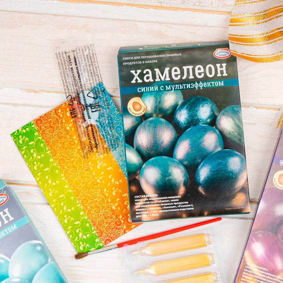 Оригинальный вариант – смеси для окрашивания. В наборе “Хамелеон” за 3 рубля: сухая смесь, жидкие смеси, кисточка, декоративная подставка для яиц. Есть и подробная инструкция по применению. Можно выбрать смеси для белых или бежевых яиц.