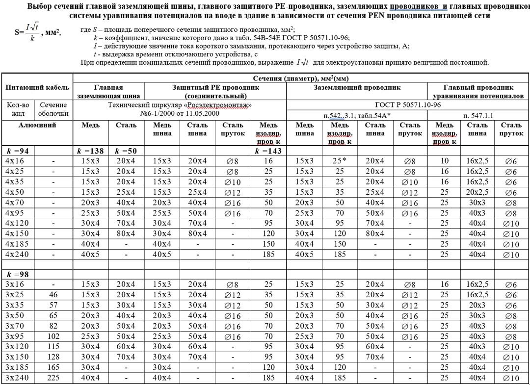 А вот уже готовая таблица для выбора сечения главной заземляющей шины для тех, кто не хочет ничего считать и желает сразу получить готовый результат.