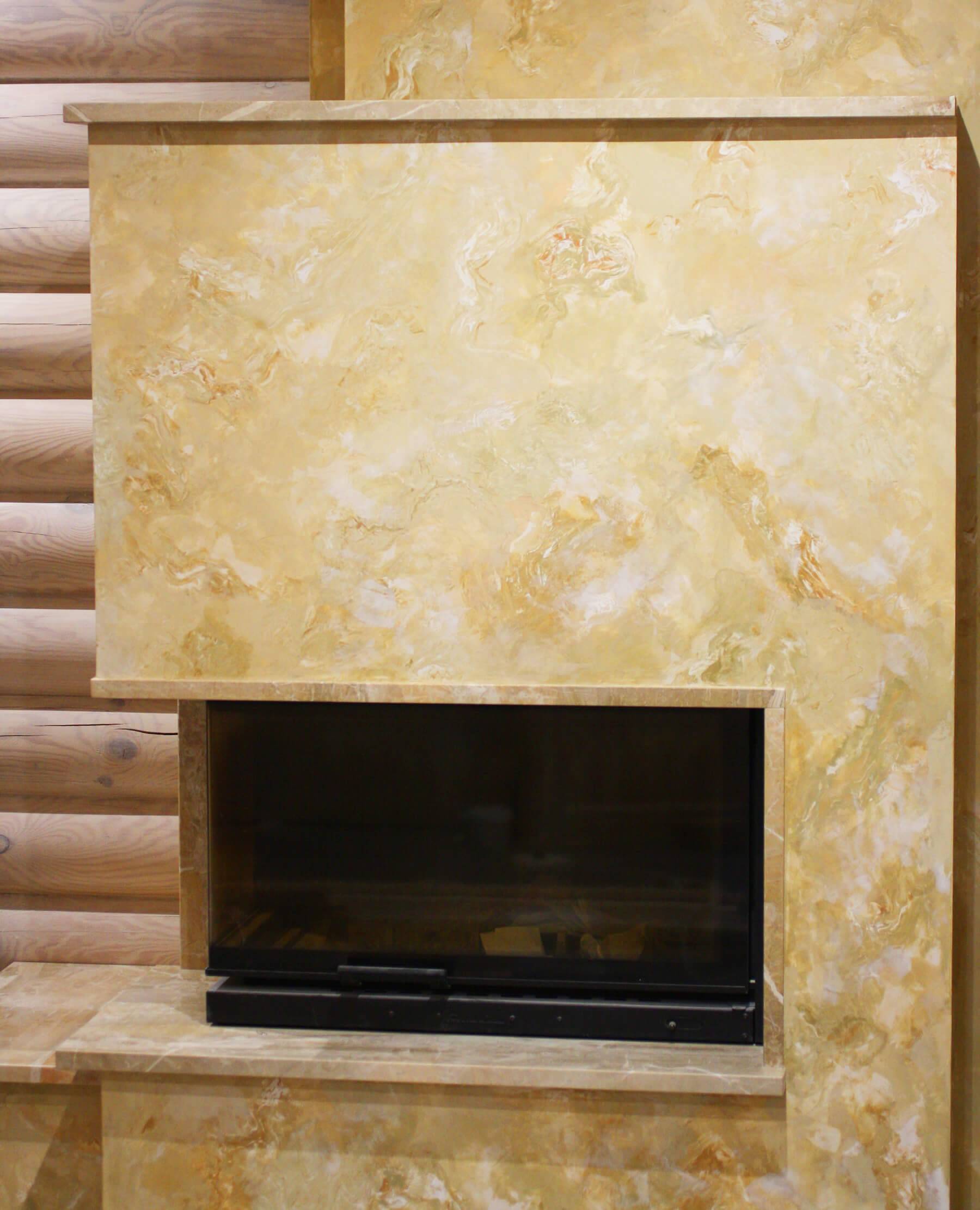 По желанию заказчиков мрамор шлифуют до безупречной гладкости, что выделяет оттенок и структуру материала, но поверхность остается матовой. Когда интерьер комнаты выполнен в старинном стиле, фасад камина из искусственно состаренного мрамора будет наиболее выгодным решением.