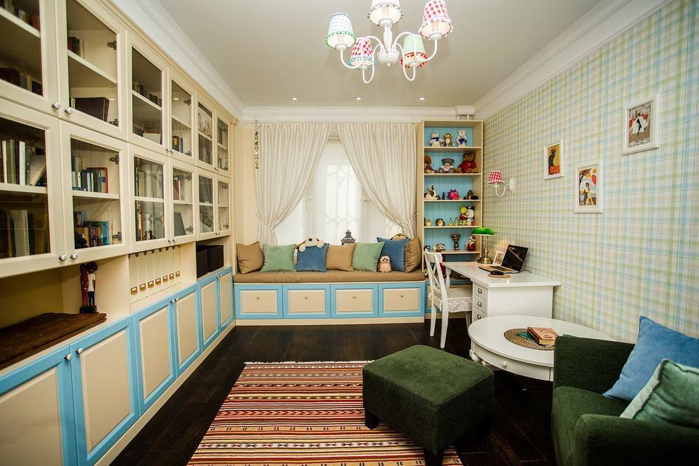 В детской сочетает классику и деревенский прованс, отличается потертостью мебели или эффектом реставрации. Цвета подбираются пастельные, для мальчика – бежевый, серый, голубой, зеленый, а для девочки – пастельно-фиолетовый, светло-желтый, розовый оттенок, рюши, оборки и банты, балдахин.