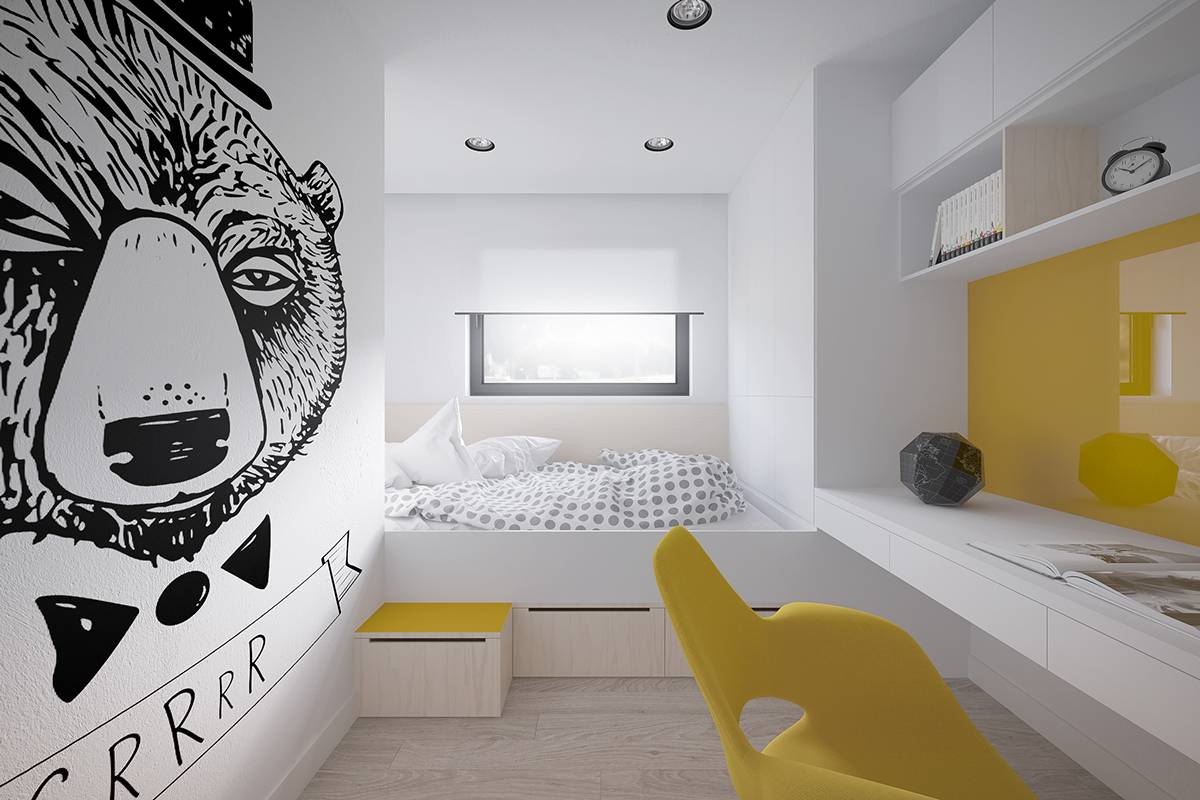 Идеальным решением для спального места станет размещение одноместной или полутораспальной кровати, которая может иметь фигурное, мягкое изголовье или даже спинку, оборудованную полками.