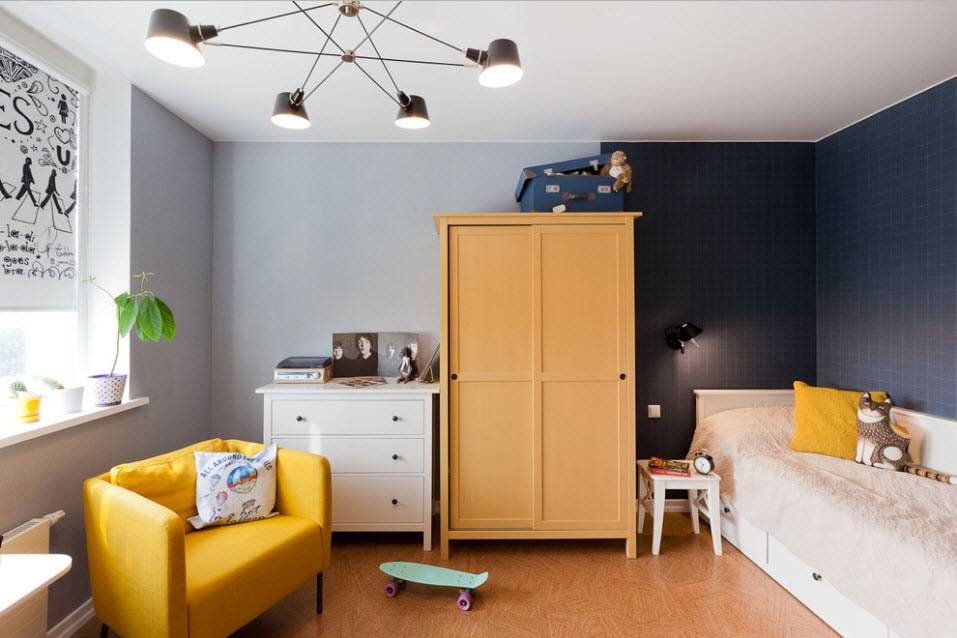 В некоторых случаях здесь располагается рабочее место или уголок для занятия своими увлечениями. Используя вертикальное разделение, можно с помощью обоев выделить функциональные зоны.