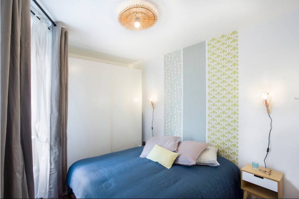 Голубые обои визуально увеличат небольшую спальню