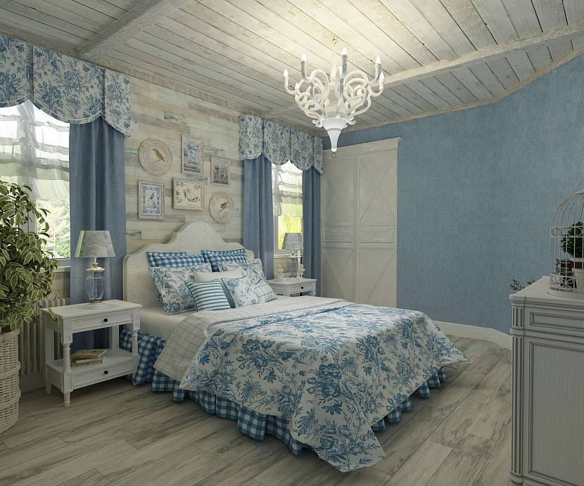 На фото спальня в стиле прованс с отделкой в разных цветах
