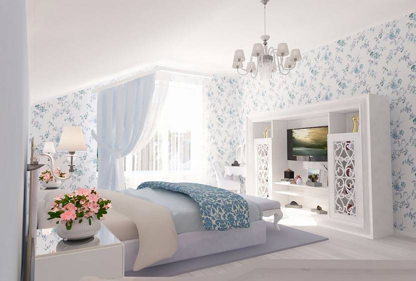 нежно-голубой цветочный орнамент обоев в спальне в стиле прованс