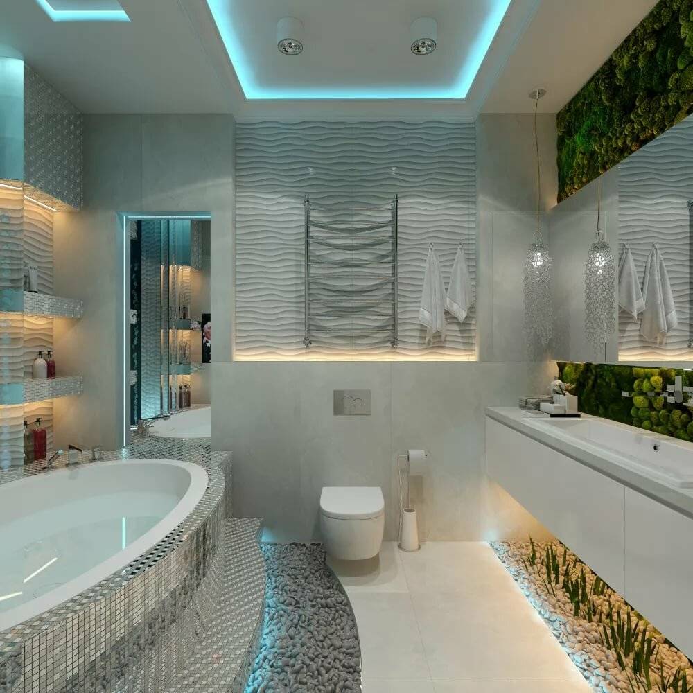 хай-тек – чтобы в полной мере реализовать идеи дизайнера, для ванны в стиле хай-тек подойдут жидкие обои. Для них характерна просто фантастическая по своей ширине гамма цветов и их оттенков