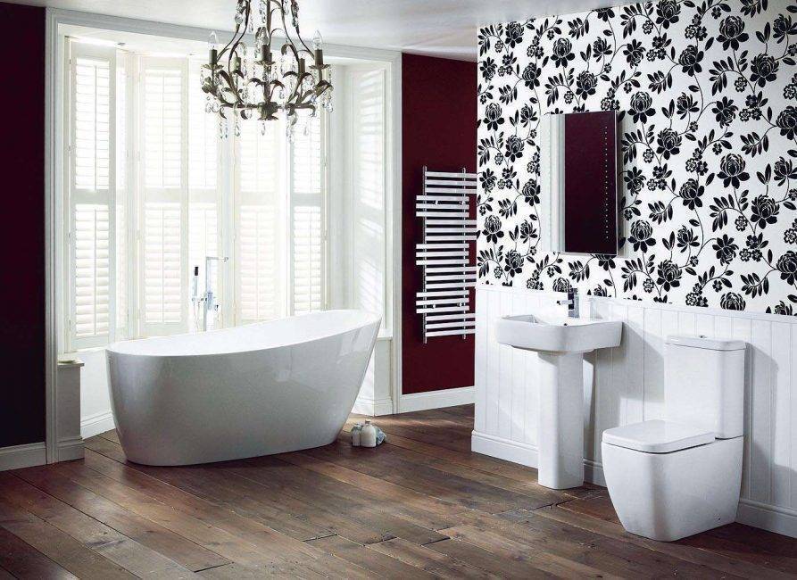 , если правильно выбрать материалы, специально предназначенные для этих целей. А плюсов от оклеивания ванной комнаты обоями достаточно много: