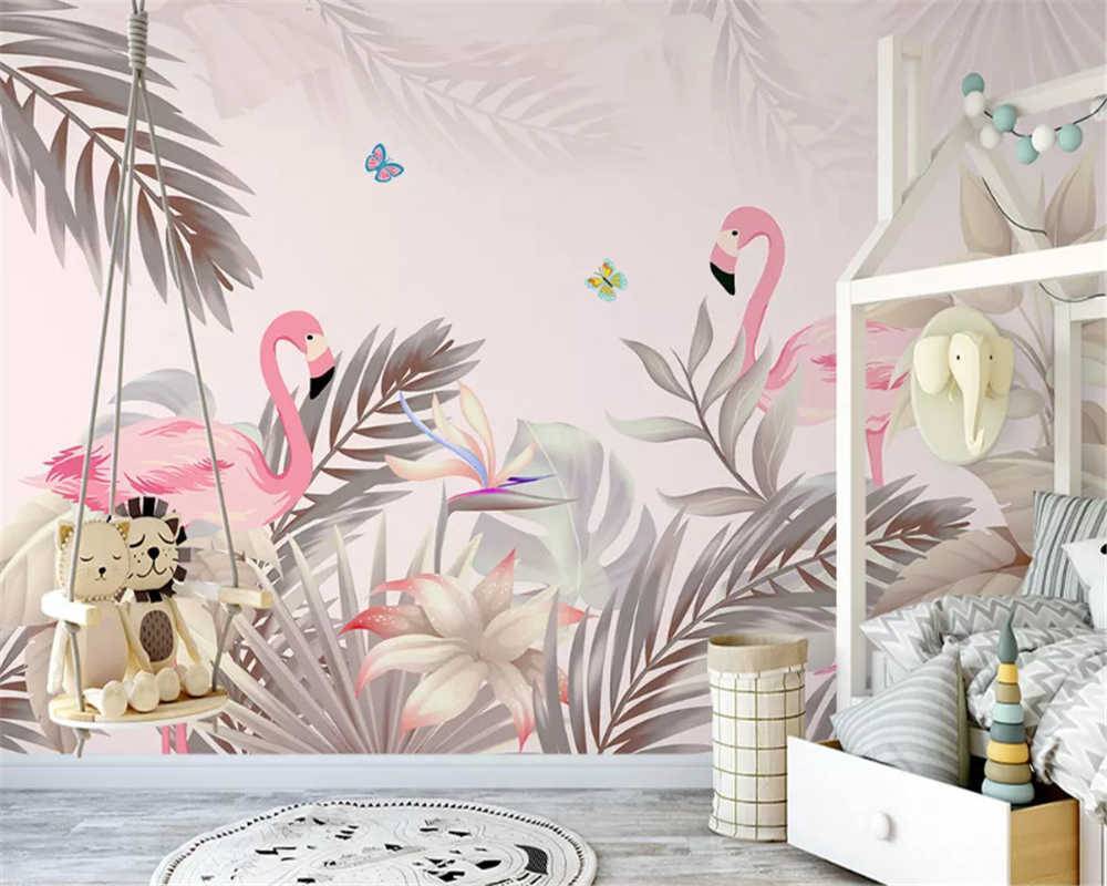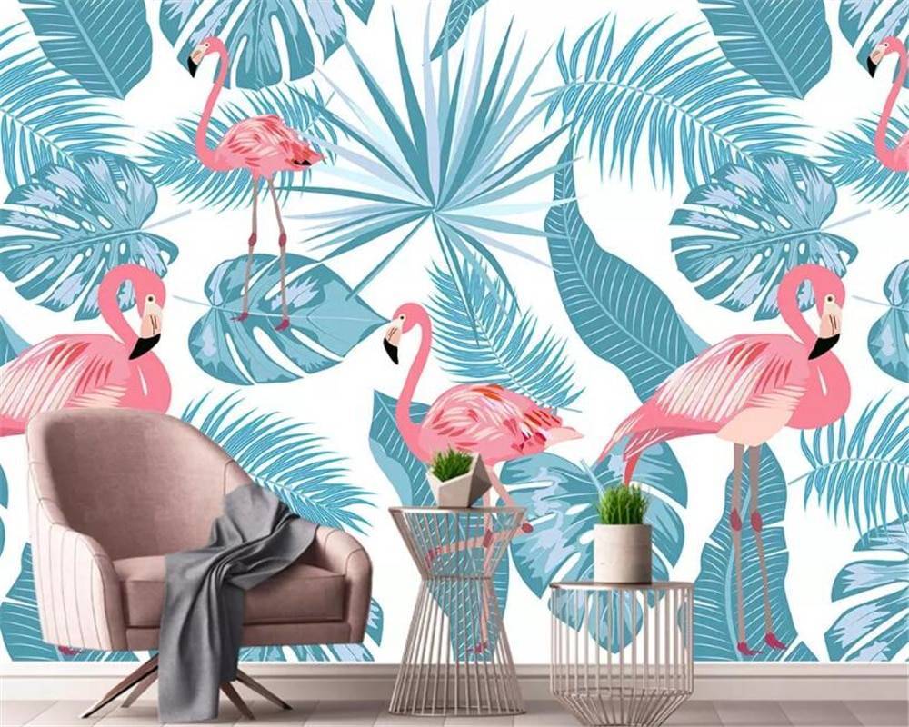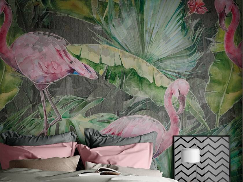 Пастельного оттенка фламинго в окружении экзотической растительности привнесут в помещение живости и натуральности.