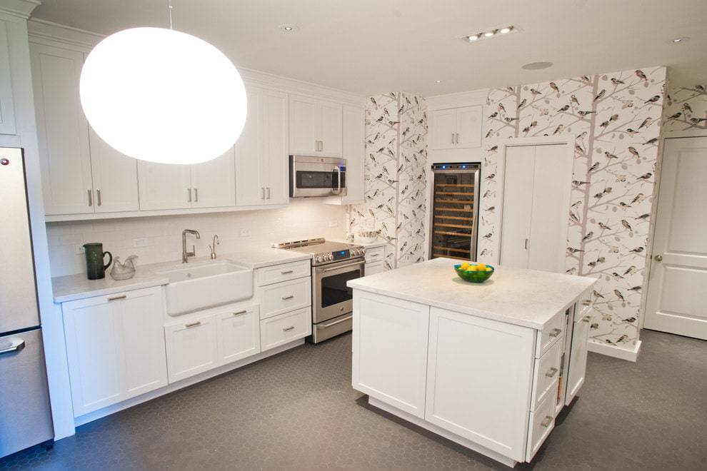 На фото кухня со стенами облицованными обоями с цветочным узором.