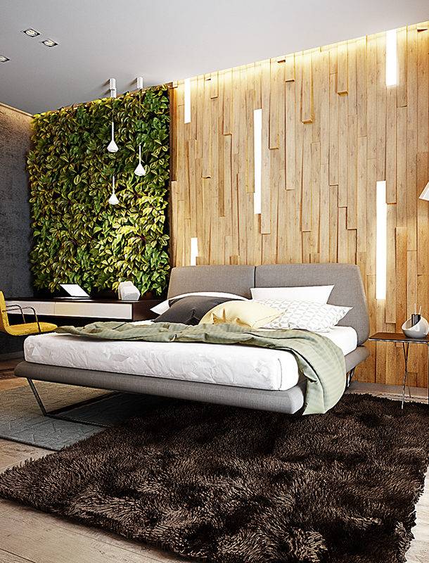 Совет: один из лучших вариантов для интерьеров модерн, лофт, хай-тек и даже минимализм – применение фотообоев, стилизованных под древесину. Нет ничего проще, чем подчеркнуть природную атмосферу в интерьере, реализовав такую отделку и украсив комнату растениями и цветами.