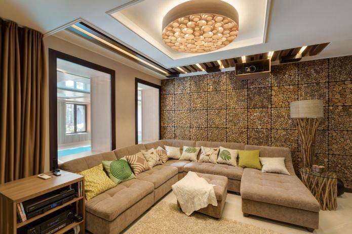 Пни и крупные спилы в интерьере гостиной могут играть роль журнального столика и стать главным предметом внимания гостей. Из спилов и гальки можно сделать акцентную стену у телевизора, из обработанных палок и веток – карниз, светильник и другие аксессуары.