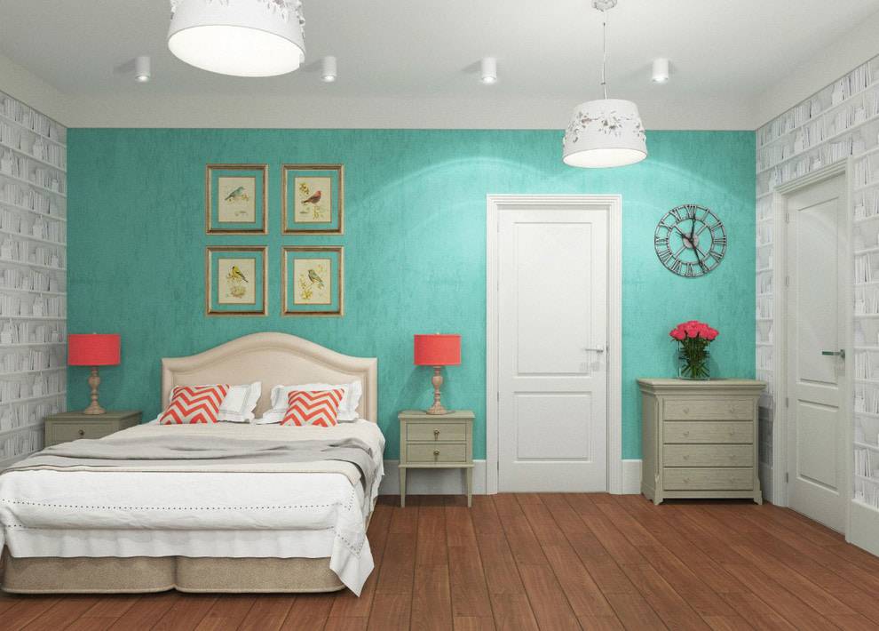 На фото спальня в классическом стиле с однотонной стеной в бирюзовых тонах.