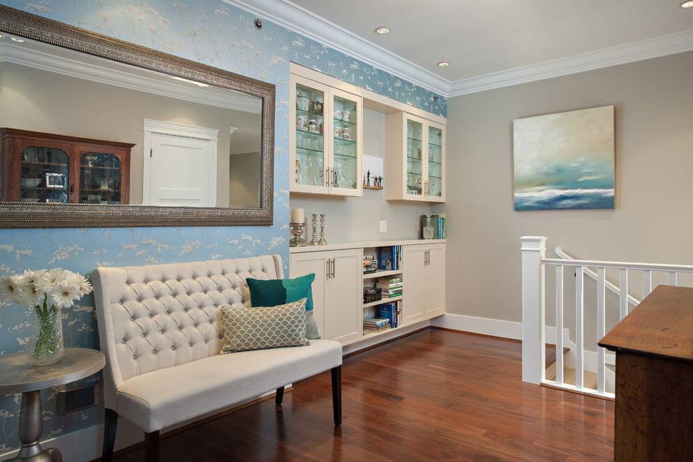 Для создания светлой прихожей лучше всего комбинировать белый потолок с голубыми обоями. Такой выбор визуально расширит коридор, добавит пространства без наличия окон.