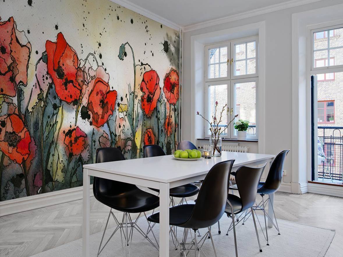 Эксцентричные цветы обладающие мощной энергетикой. Маки смогут выгодно подчеркнуть декор помещения если ими обклеить только одну акцентированную стену.