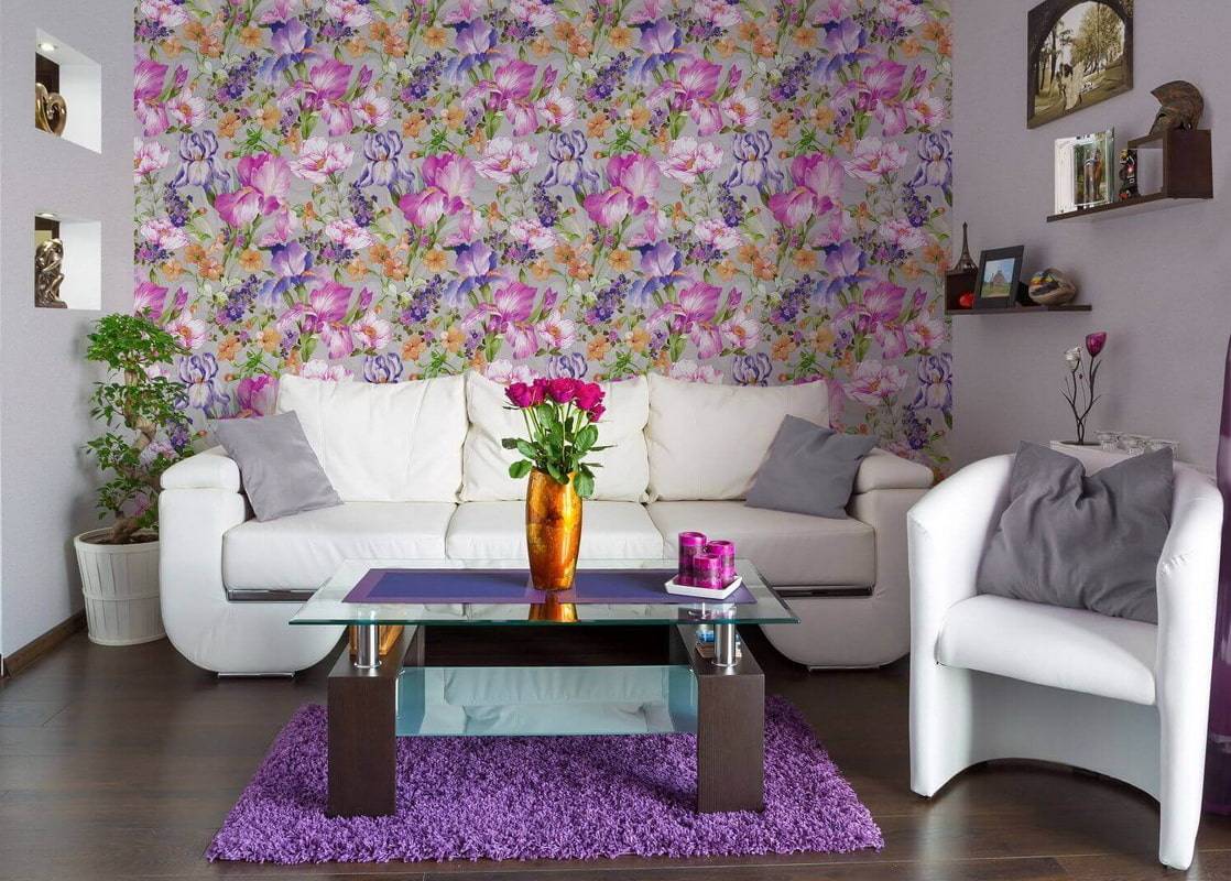 На фото зал декорированная обоями с крупным цветочным принтом.