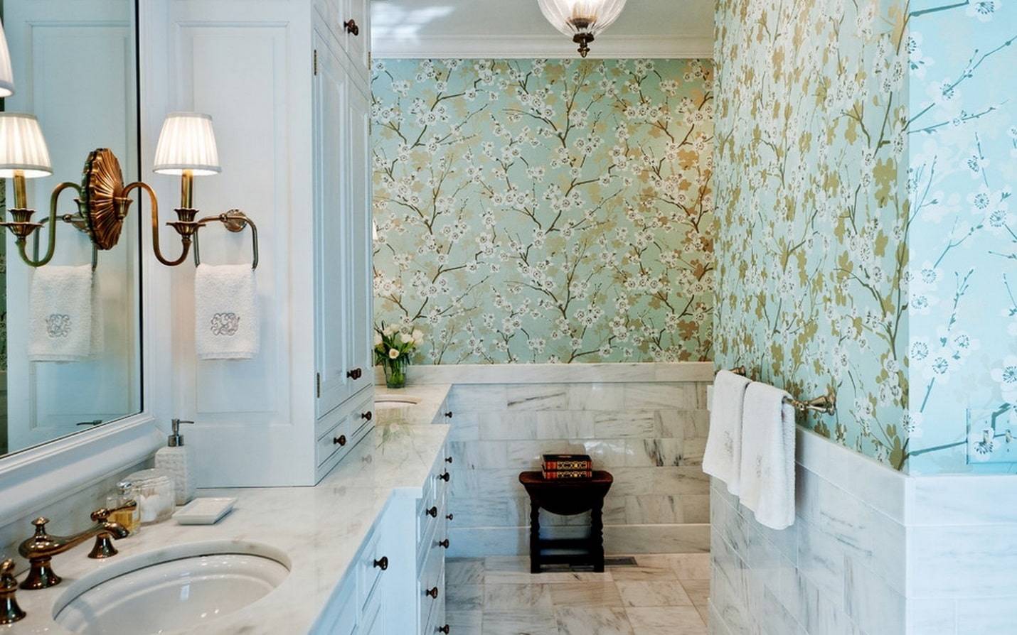 На фото ванная комната с нежно-голубыми обоями с цветущей сакурой.