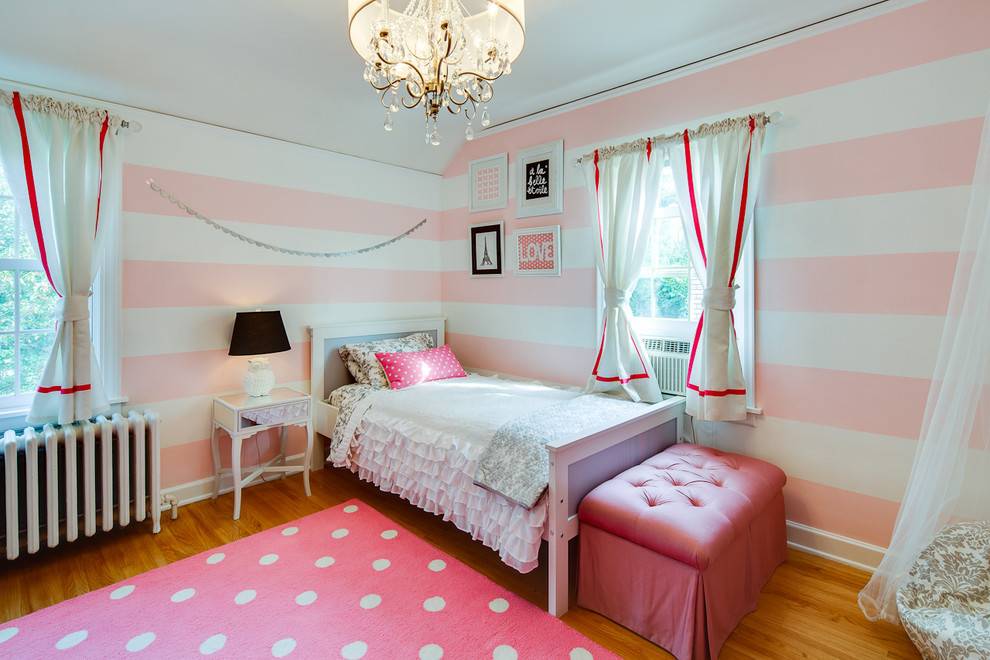 Полоска позволяет придать интерьеру детской комнаты для девочки подростка динамичность и яркость. Однако чтобы полосатые обои не раздражали глаза, лучше выбирать неброские варианты, я контрастную полоску размещать только на одной стене. Чем ярче цвета в полоске, тем меньше пространства она должна занимать.