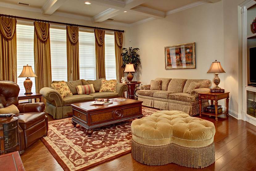 Классическая гостиная оформляется в выдержанной и естественной цветовой гамме, но при этом используются сложные оттенки. На первом плане светлые молочные, кремовые и пастельные тона либо же все оттенки дерева. В качестве акцентов – глубокий и благородный винный, изумрудный, сапфировый, терракотовый, виноградный.